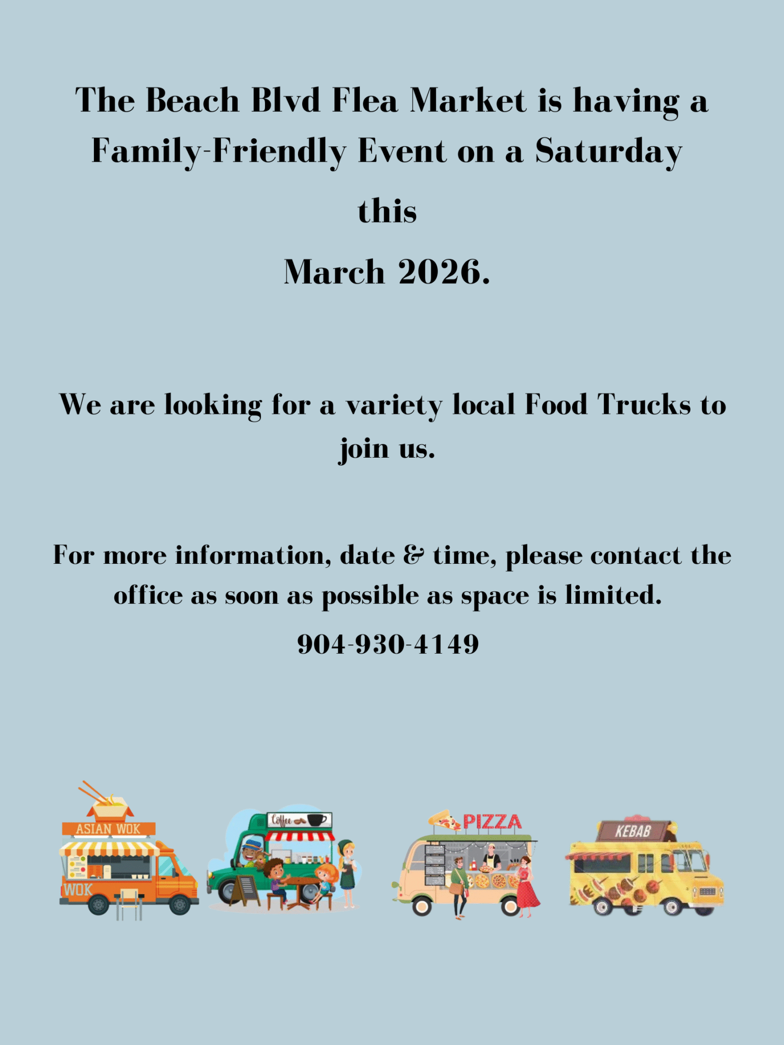 All rentals must be done in-person. We cannot reserve spaces over the phone or via email. To reserve vendor space at the Beach Boulevard Flea Market, we ask that you visit our office during normal business hours.